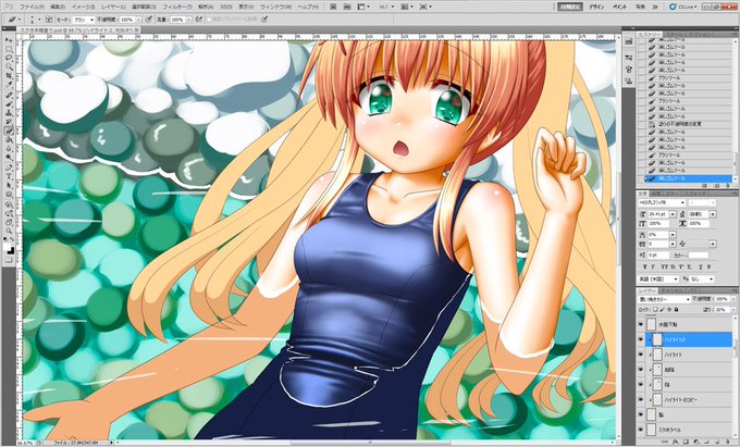スク水紬さん進捗。今回コントラスト強めにしてるけど、濡れてるところと乾いてるところ、わかるかな・・・?