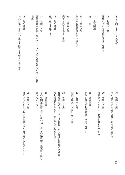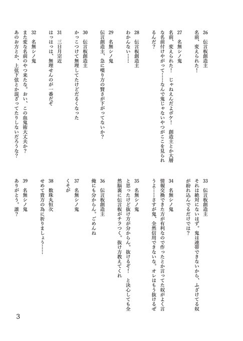 天下五剣を含む刀剣男士6振ときめつの雑魚鬼が、鬼の偽物(時間遡行軍)を倒すべく一緒に頑張る謎のクロスオーバー本。雑魚鬼用の匿名伝言板上で話が進みます。何でも許せる優しい人向け。イベント後BOOTHで通販予定です。