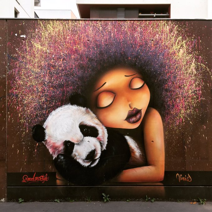 Lil' Gal & her 🐼 by @VinieGraffiti #viniegraffiti #vinie & @JessyDoudouStyl #doudoustyle #doudoustyleart #streetart #graff #spray #wall