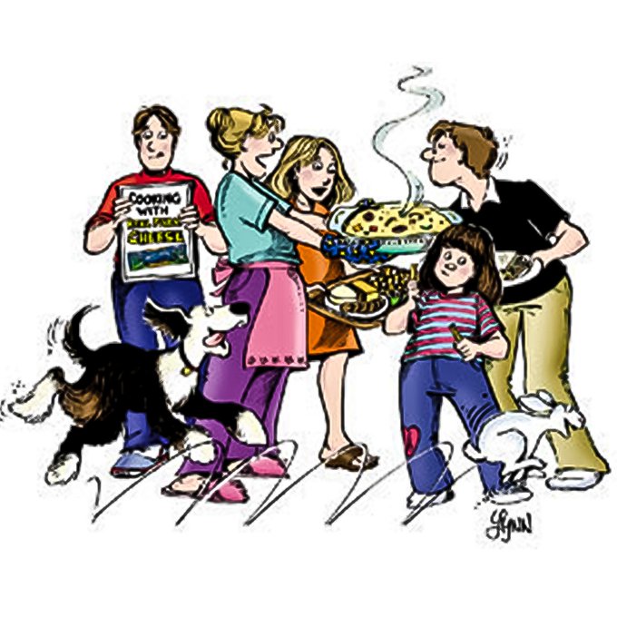 Image Description: The Patterson family. Michael (far left), Edgar (in front of Michael, black and white dog), Elly (in the middle left holding casserole), Elizabeth (middle right), John (far right), April (in front of john) and Mr. B (running, white bunny)