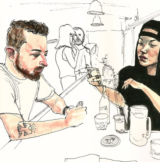Few weeks ago at international and Brianna ink & watercolors in sketchbook.