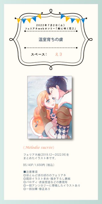 #剣花2 #剣花2_告知 7/2(土)フェリアネwebオンリー「剣に咲く花2」お品書きです。 新刊の再録イラスト本通販とイラスト展示予定です。 少し早いけど通販予約始まりました ↓ https://t.co/PoPbCfIsMt よろしくお願いいたします。