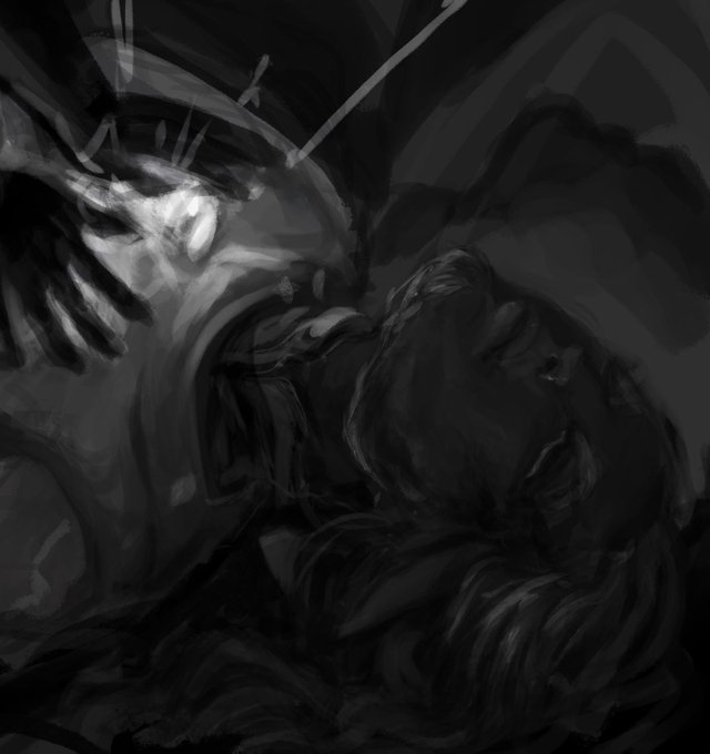 more progress shots bc im, so happy with how this fella's chugging along [progress on the b&w painting and a mockup colour overlayyy]