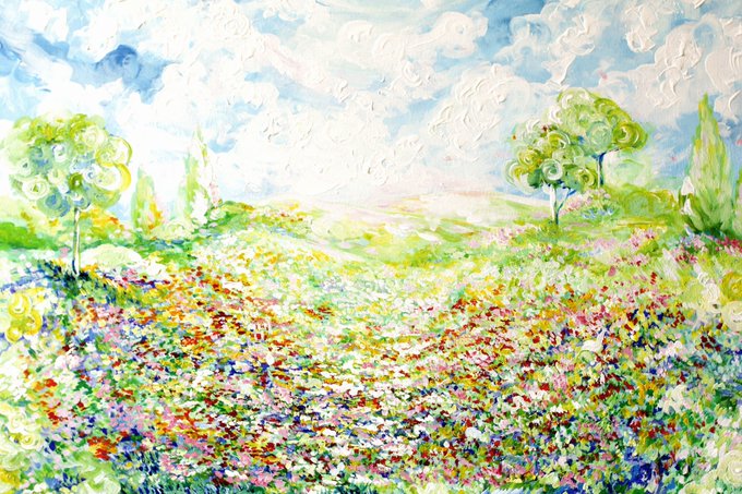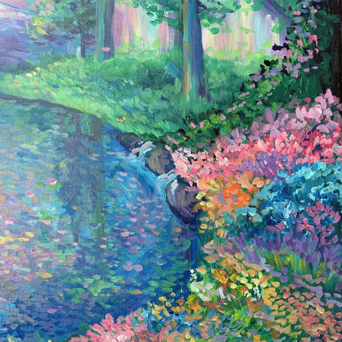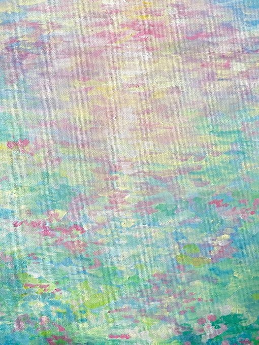 ซูมดีเทลน้อน ชอบทุ่งดอกไม้ที่ตัวเองวาดรอบนี้มาก กับแสงพระอาทิตย์ที่สะท้อนในน้ำ พึ่งปั่นงานมอเสร็จ ลงตอนนี้จะมีคนเห็นมุ้ย #art #painting #paintings #อวดโฮมุ้ #มาอวดโฮมุ้ #สายผลิต #สายผลิตงานมือ #สายผลิตผู้อยากเติบโต #โปสการ์ดแต่งห้อง