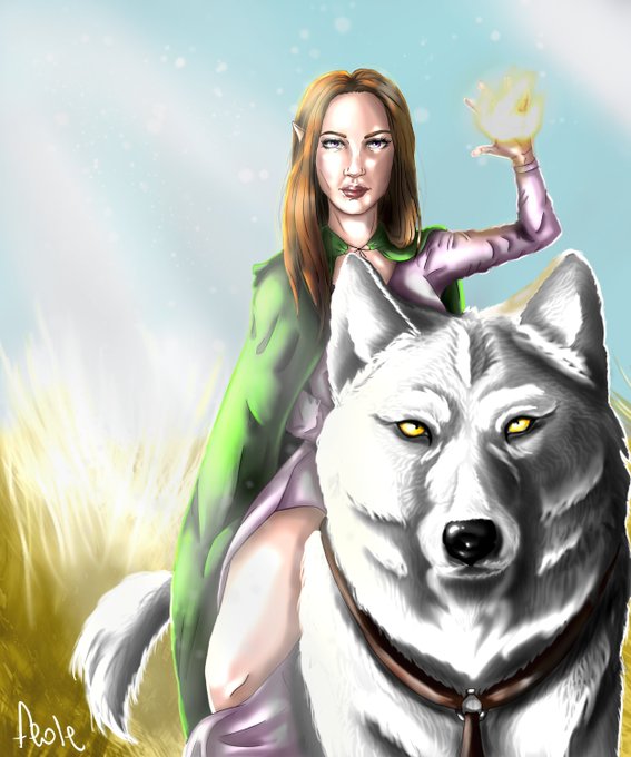 I finished it! She's Ylrielle, @Debinthedas' OC from #PathfinderWotR  with her majestic companion, Snouty 😍 Ylrielle is a half-elf sylvan sorcerer and I love her 😍