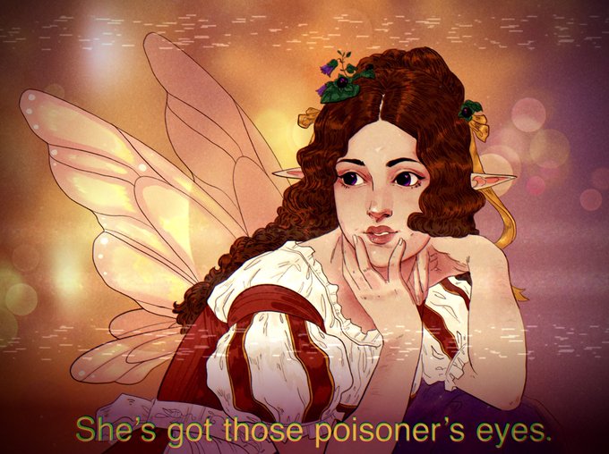Poppy Milk (she/her) and her complete wardrobe! She’s a fae druid who loves birdwatching, fashion, and poisons 🥰