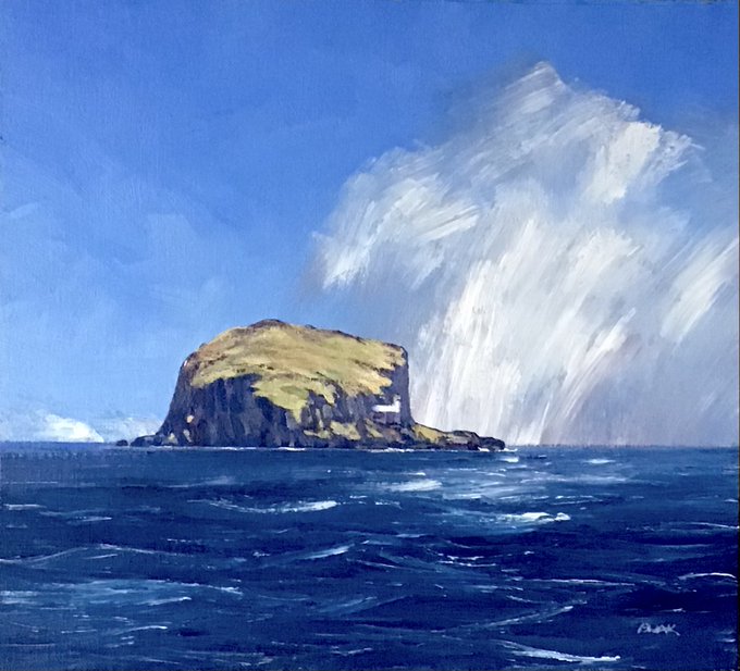 Three cracking portraits of #BassRock from John Boak, all Acrylic on Canvas, in the current exhibition - Dawn, 44x54cm, The Rugged Knowes, 38x43cm and The Squall, 32x35cm.