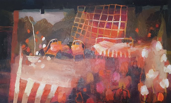 Beautiful colours & light in this piece by Hazel Nagl RGI RSW PAI - Summer Night #Kilbarchan, Mixed Media, 70x53cm.