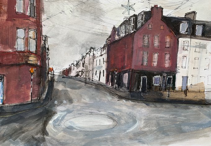 Instinctive & expressive drawing & painting from both artists, this one from Ann Cowan - #Dunbar in December, Acrylic, Watercolour & Ink on Board, 21x30cm.