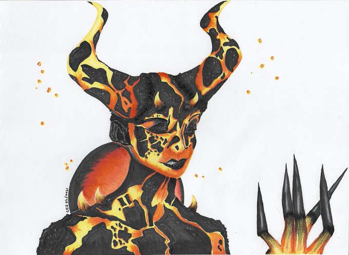 Part 3 of my drawings of @madeyewlook's make-up/body paint series & my absolute favorite so far! I love the colors of her design (especially the horns!) & had just as much fun drawing it 🧡