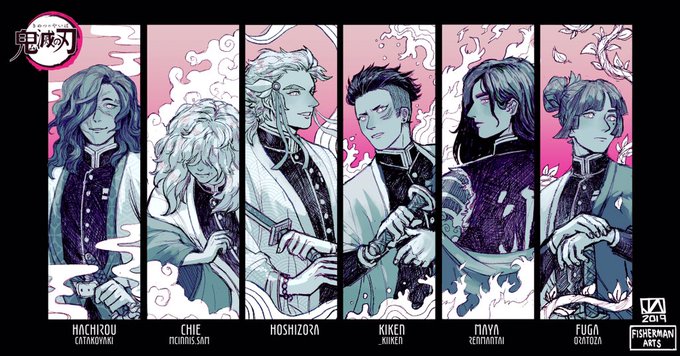 A KNY OC poster with Hachirou (catakoyaki (insta), Chie (mcinnis.sam (insta), Akio, Kiken (@_Kiiken), Maya (@renmantai), and Fuga (@oratoza)! In my dreams, this is a Pillar lineup 👀