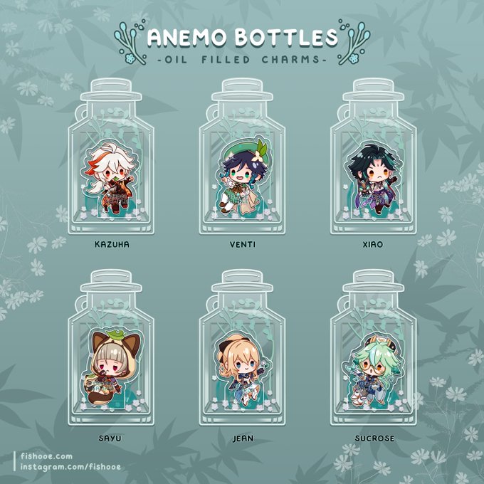 Available designs for #GenshinImpact anemo bottle pre-orders! just added #Heizou 🔍