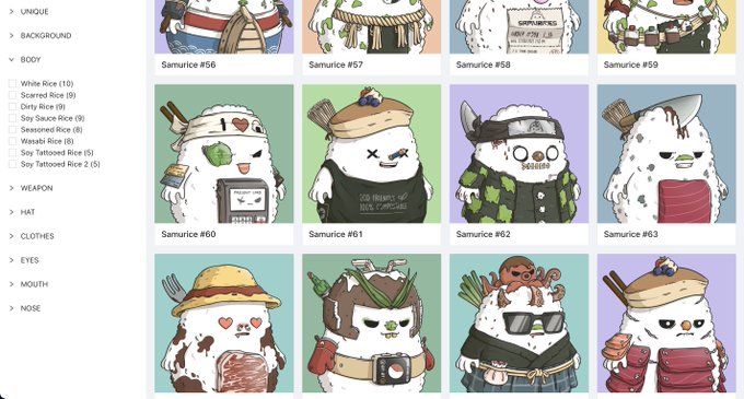 I've quickly dev an "Opensea-like gallery" for my own use to be sure the collection looks great and diverse, and to easily check if there are any rendering issues! Really amazed to see how cute and unique the Samurices look 😳😭
