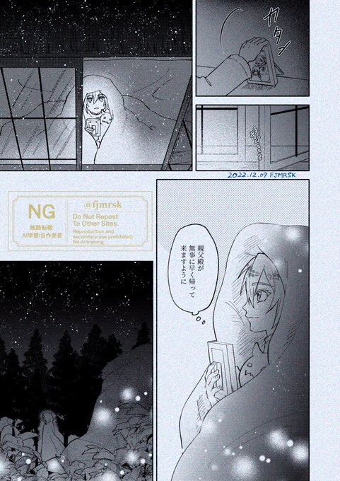 『願い星』 紅銀親子③ 以前発行した、紅銀親子再録集のために描き下ろした漫画でした。この本を発行した次の日に7章の配信が始まり、リリアに魔力が尽きたから中退して最期を1人で過ごすと言われて頭を抱えたのがもう懐かしい……ヴァンルージュ親子が少しでも長く共にいられますように!
