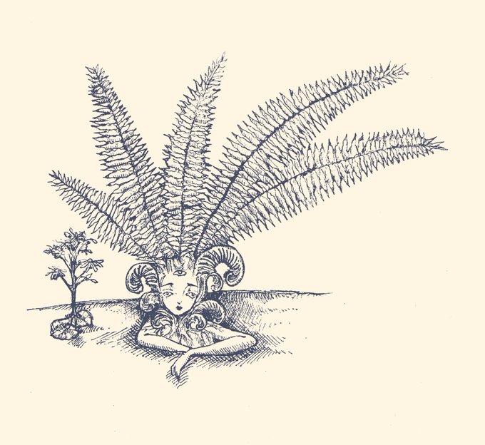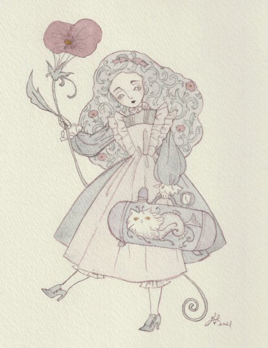 頭が菫の貴婦人、頭が金魚鉢の詩人、身体から植物を生やした娘たち、脚だけで走る幽霊たち、六本足のやさしい獣、ねこ魚(ネコギョ)、走りまわるアルマジロ、ヴォイニッチ手稿の植物などを、ペンや水彩・アクリル絵具で描いています。