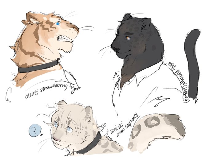 some big cat vers of ollie, eric, & shiori! i'm pretty sure snow leopards have round pupils but since shiori has w-pupils in canon, i decided to give him slit pupils in this vers