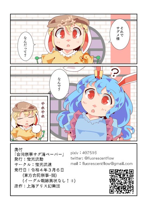 4月10日に川崎市産業振興会館で開催予定のイベント「地獄鬼獣極楽祭」にて【お-19・蛍光流速】にてスペース頂きました。新刊は袿姫様と袿姫様の後ろのドラゴンもどきと霊長園過去妄想本です。pixivにもう少しサンプルがあります。 https://t.co/vWHHp2LA00