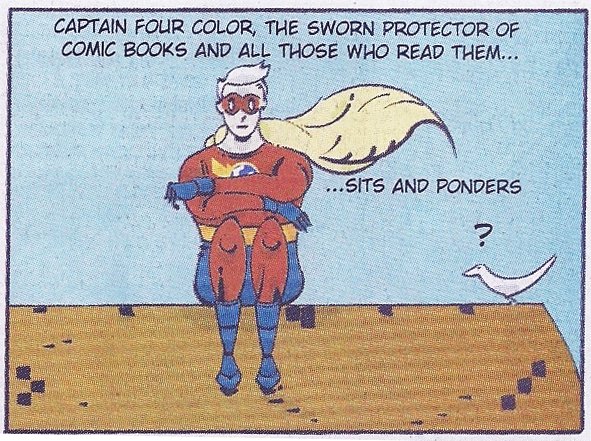 @inkskratch @strangeadventrz @AustinBooks @CaptainBlueHen Hello Eric--- Meet Captain Four Color, the super-hero mascot of Flying Colors Comics.