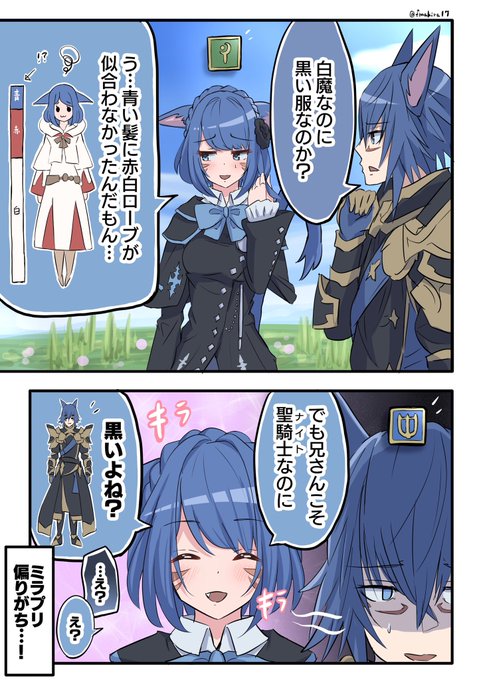 うちの兄妹ッテちゃんたちの妄想マンガです…!最近白魔触り始めたのですが、オシャレすると大体似たような見た目にしてしまう…助けておしゃれ番長…。゚(゚´ω`゚)゚。 笑(あと切り抜きSSにクレジット表示入れるようにしました!)