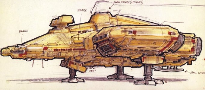 エイリアンのノストロモ号。雑誌等にロン・コッブとクリス・フォスのスケッチが大量に公表されていたけれど、どれも映画に登場した物とは形状が違っていて、ハテナと思ってたんですが、先日、これまで自分が見たことのなかったスケッチをネット上に発見して、ようやく長年の胸のつかえが取れました。