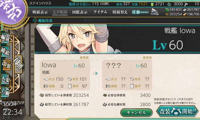 燃費とか色々気になることもあったがIowa改造しちゃった #艦これ 装備楽しいの持ってくるし