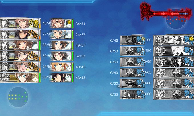 E5丙第1ゲージを削り始めます。 初見、長門が中破してるにもかかわらず、むっちゃんタッチできれいに撃破してS勝利。つよい(確信) むっちゃんタッチは強くてかっこういいので改二にして良かった #艦これ