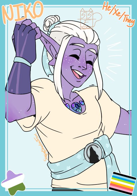 Here's Niko! He's genderqueer and queer! They use he/him, xe/xem, & they/them interchangably! Xe's probably also fine with other pronouns, but xe hasn't experimented much past those. He is comfortable with any gendered terms, but prefers neutral or masculine ones!