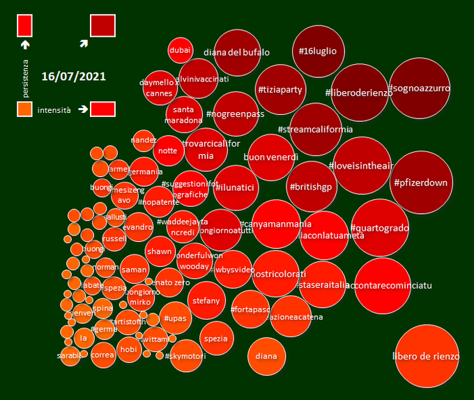 #hashtag di tendenza ieri (dimensione: intensità, colore: persistenza): ... #orlandera #imolagp #unavoltaliberi ... #superlega ... #domenicadiprimavera ... #ufcdaznitaly #traimaledetti ... #tgindahouse ... #mezzorainpiu #pierxlive ... #iostoconsalvini ...