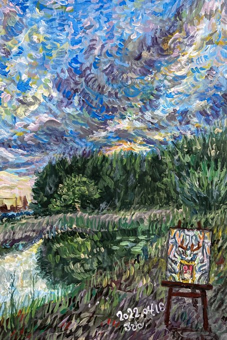 【イイジマフヒトの毎日つくる2022】 綺麗な空だったのを描いた! イーゼルの上には昨日の絵が。 2022.04.16(土) #イイジマフヒト #毎日つくる2022 #空 #昨日の絵の #額としての絵 #風景画 #抽象画 #絵葉書 #パズル絵 #増殖する絵 #終わらない絵 #水彩画 #油絵