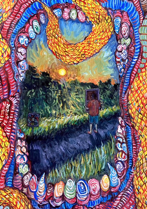 【イイジマフヒトの毎日つくる2022】 2021年7月3日付(ツイート2の画像1)、続いて7月31日付(ツイート25画像2)で描いていた額シリーズ、今回で中を埋め、完成! 描いた絵を太陽に見せる男の絵を描いてみた! 道端には昨日描いた絵が。