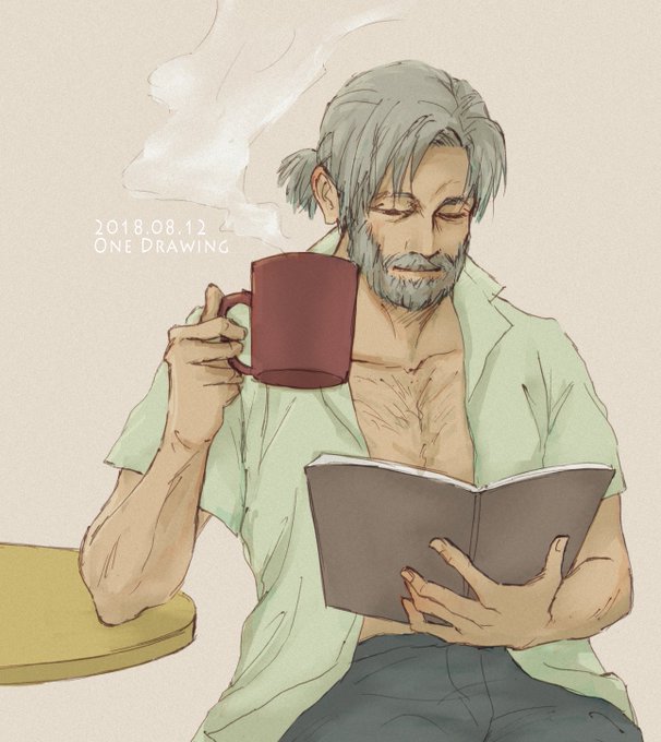 #ヒゲ版深夜の真剣お絵描き60分一本勝負 お題【コーヒー】【本/読書】 ハンクさんで失礼しますー