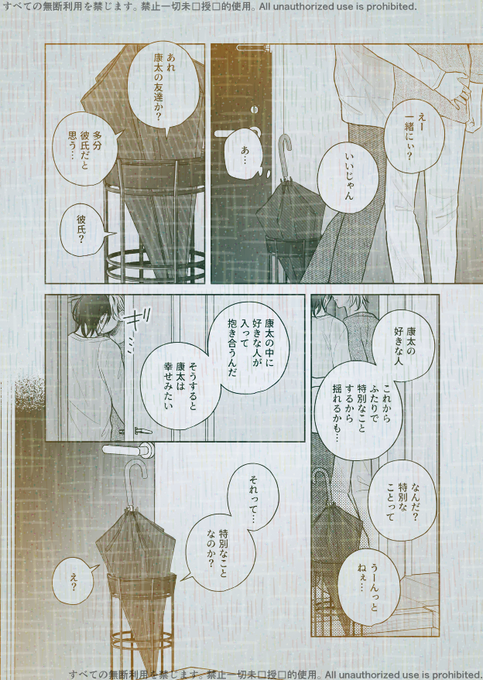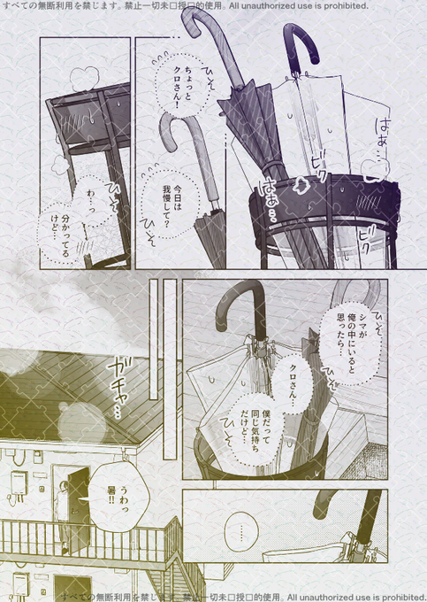 昨日は所用(友達と飯食って花火してた)で更新できずにすみません💦 今日の傘傘です。次がX更新分最後の話です~。 擬人化も擬物化もしていない、ガチの無機物BL「傘と傘立て」⑥傘のもうひとつの姿の回 1/2 #創作BL #無機物BL