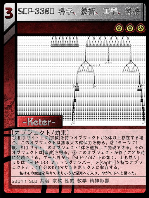 #SCP_TCG_JP_J 科学、技術、工学、神格。宗教付与+相手サイトに宗教三体で確保力が超限に。終了したら下の如くかミッシングナンバーをKeterに追加。saphir切り札枠。