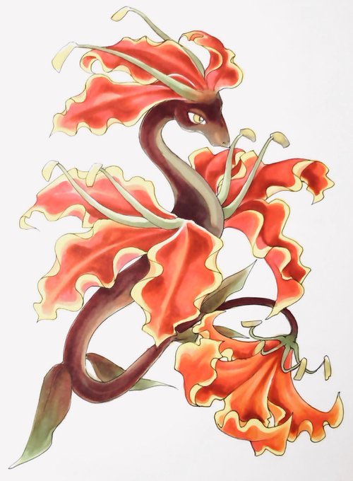 遅刻参加失礼します!グロリオサの花がモチーフのドラゴンさん描きました!