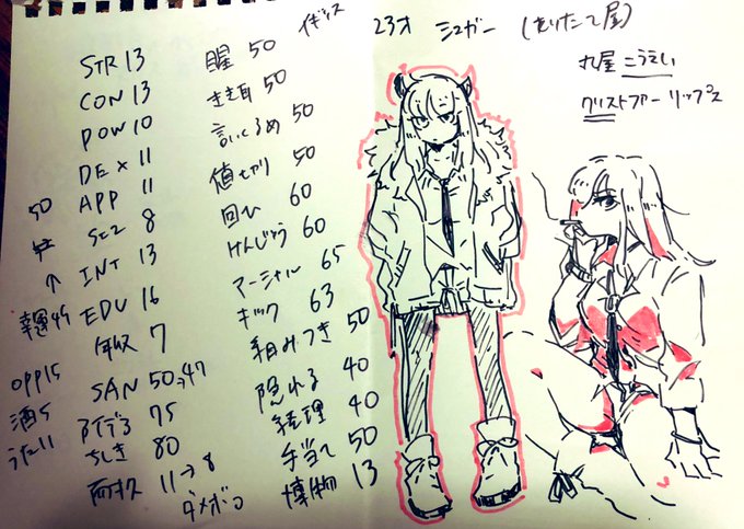 @TRPG_TL シュガー(23)取り立て屋。イギリス出身(神父の娘)右は前イメージで描いてたやつとちょっとやったイカモチーフで作った