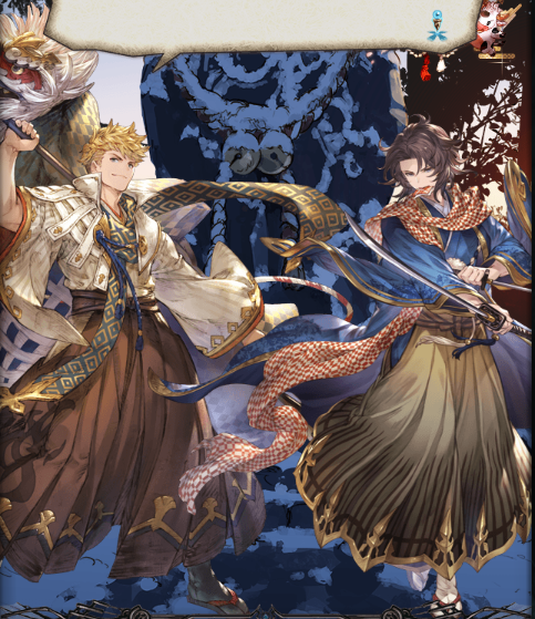 メインストーリー配布キャラ、流浪の王子リオン、王子と行動を共にする機械兵初号機ディミス、機械兵に改造され妹を奪われた狩人フレンリーゼ、暗殺者アケハ。