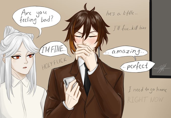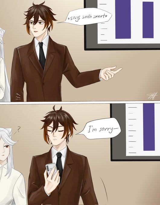 A small continuation to the modern #zhongven au. Zhongli works at home and Venti wants his attention 24/7