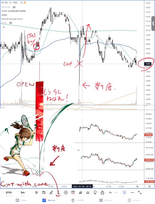 住友ゴム 寄り底を確認したのかしないのかするつもりがないのか狼狽狼狽で中途半端なところでカット。寄り付きの損切りは底を確認して慌てて切らない、、、。急いで切って正解なこともあるのでこの辺りよくわからない。SONGIRI with care.