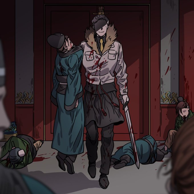 39화 가로컷 연출용 그림. 조조에게 원소가 손수건을 건네며 걷는 장면입니다. 무적핑크 작가님과 저는 조조가 다른 캐릭터와 함께 나왔을 때 화면에서 차지하는 면적이 너무 적지 않도록 항상 신경쓰고 있습니다ㅋㅋㅋ