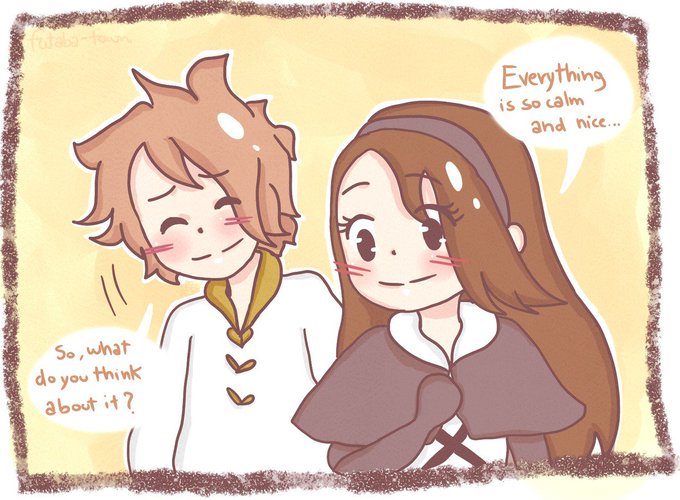 this was for a bravely secret santa on tumblr!! soft babies... tiz is showing agnès around norende 🌿💚
