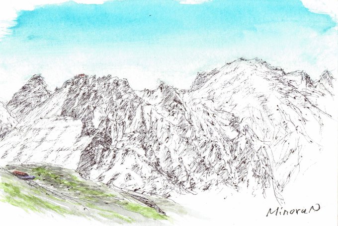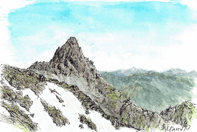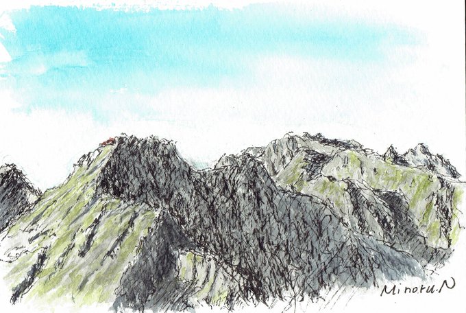 南岳に連泊した日は終日南岳と中岳でスケッチ三昧。山行中描けた11枚中5枚をこの一日で。日陰の無い山頂でじっと描いていたので気が付いたら腕は真っ赤。登ってくる方からも、動かない山頂の縞模様(私の上着)が遠くから不思議だったとのこと。薬師岳方面の沢山の山々も懐かしかった。
