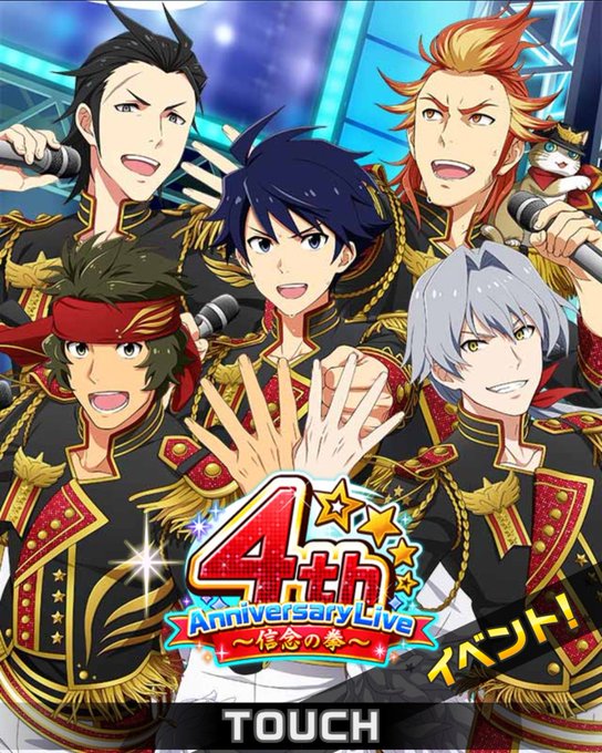 担当が4周年のトップ画面にいて衣装も黒赤でめちゃめちゃ似合う……嬉しい…………