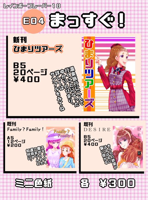 レイフレのお品書きと、新刊のサンプルです!ミニ色紙は描けるだけ描きます!! 既刊はどちらも10部ほどです。(新刊・既刊すべて全年齢向) スペースは【E04】です!よろしくお願いします! #レインボーフレーバー18 #レイフレ18