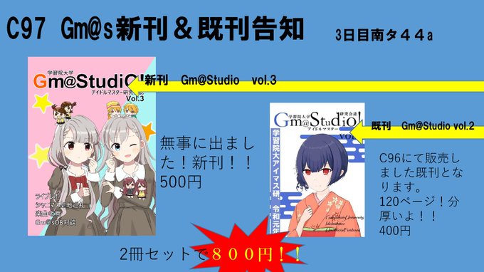 【C97情報】 新刊「Gm@Studio vol.3」を出します!! 3日目南タ44aでの販売です C97での既刊との2冊セットで非常にお買い得です! 是非お買い求めください〜! 記事については少しずつご紹介していきますね (ツミナ)