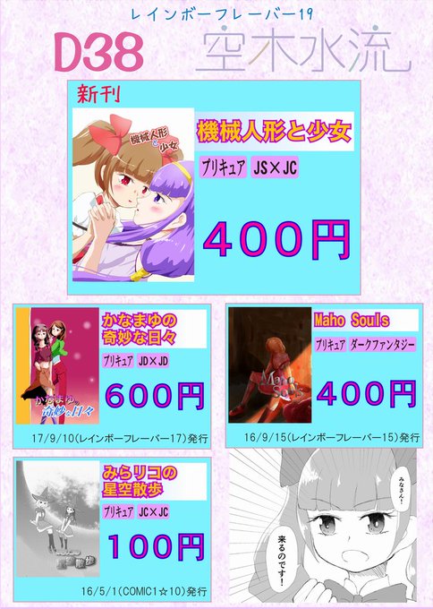 明日のレインボーフレーバー19のおしながきと見本です。新刊はえみルー本です! ※さあやがルールーを分解する話ではありません。 スペースはD38 空木水流です。よろしくお願いします! #レイフレ19