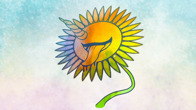 うちの動画のEDによく登場するコレ…実は私自身ではなくて名前は「フラコーン」。向日葵にユニコーンの角が生え、何かをせせら笑うように舌を伸ばした姿。色の決まりはなく、私の気分やコラボ相手様のイメージ色によって変わります。っていう設定メモ。