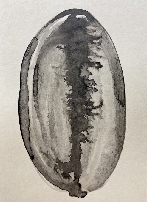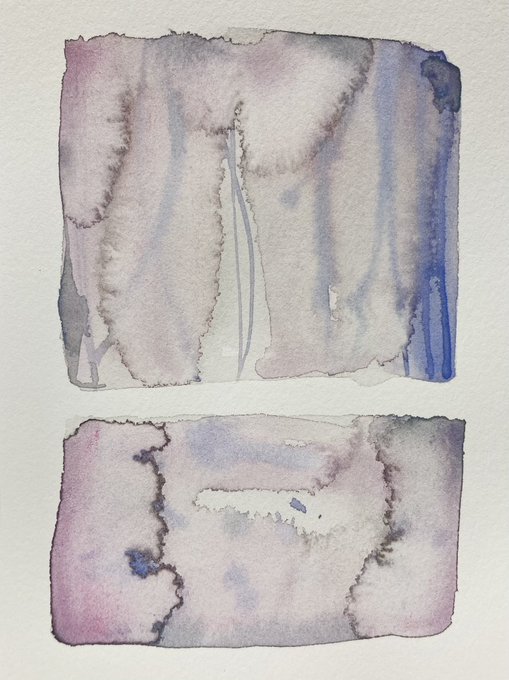 パレットの広場に出てた色をわーっと水で拭くようにして出来た薄いグレーを最初に塗り、青系を滲ませた後、差し色としてキミドリや黄色を差し、オペラをほんの少し加え。乾いてからマスキングインク用に買った筆で細いタッチを重ねました。