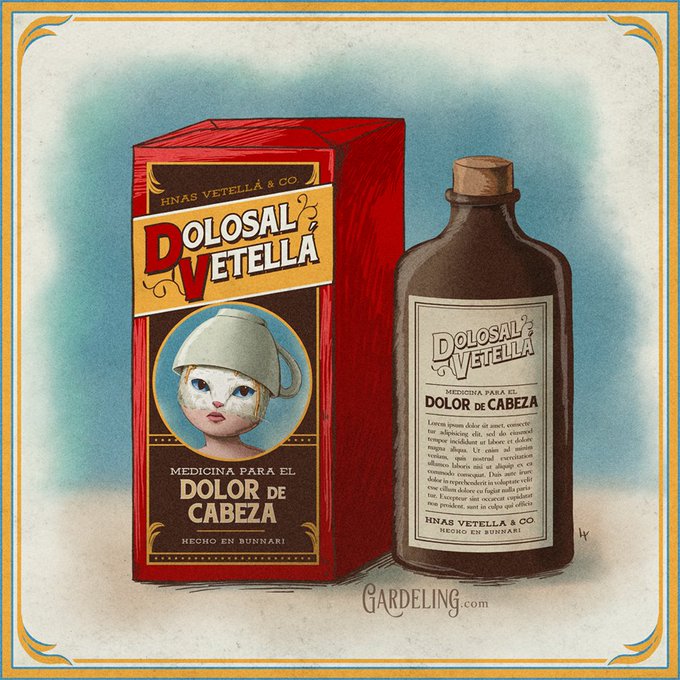 Los dolores de cabeza aquejan hasta el más resistente gardelino. Para evitar el malestar y las consecuencias que acarrea, las hermanas Vetellá han desarrollado uno de sus tantos tónicos sanadores. #gardeling #vintage #cat #antique