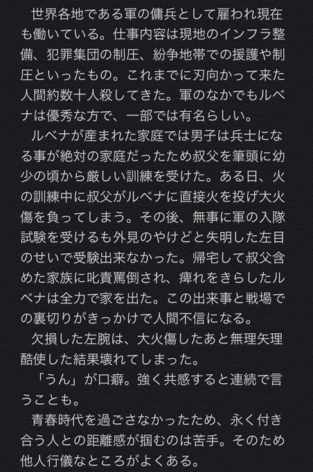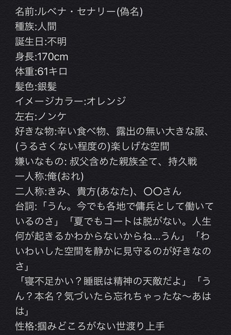 マフィア[# ディザーレ]に所属している14歳の少年。普段は武器の開発、仕事では首領の影武者として活躍している。大人のように振舞っているが、気が抜けたときや予想外のことになると子供らしい一面が見られる。