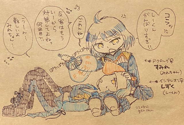 @pkgmousou これは、ラプスも撮ったことだし、つくさんにも実物送りつけよ(`・ω・´)って、お借り絵をスケブから切り離してた時に「ん?待って?!バルグとアペちゃん並べられるじゃん!!」と気づいた現珠さんが撮った写真です。これは楽しいな。